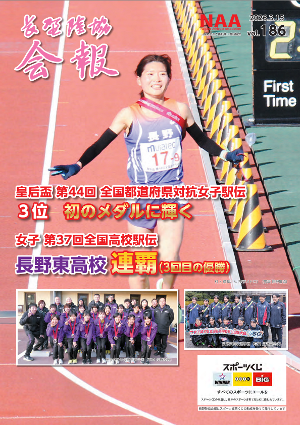 本号は独立行政法人日本スポーツ振興センタースポーツ振興くじの助成を受けて発行します。吉岡選手のU20世界選手権での活躍は見事であり、全国高校総体も倉田さんの優勝を含む上位入賞4、下位入賞4、並びに全国高校定通大会での優勝4、入賞4は近年にない活躍で、栃木国体はじめ2028年の「信州やまなみ国スポ」に向けて大きな一歩になると思います。一方、8月8日全県に「医療非常事態宣言」が発出され大変な状況ですが入念な対策のもと前向きに取り組みましょう。 発行にご協力いただいた皆様に感謝申し上げます。